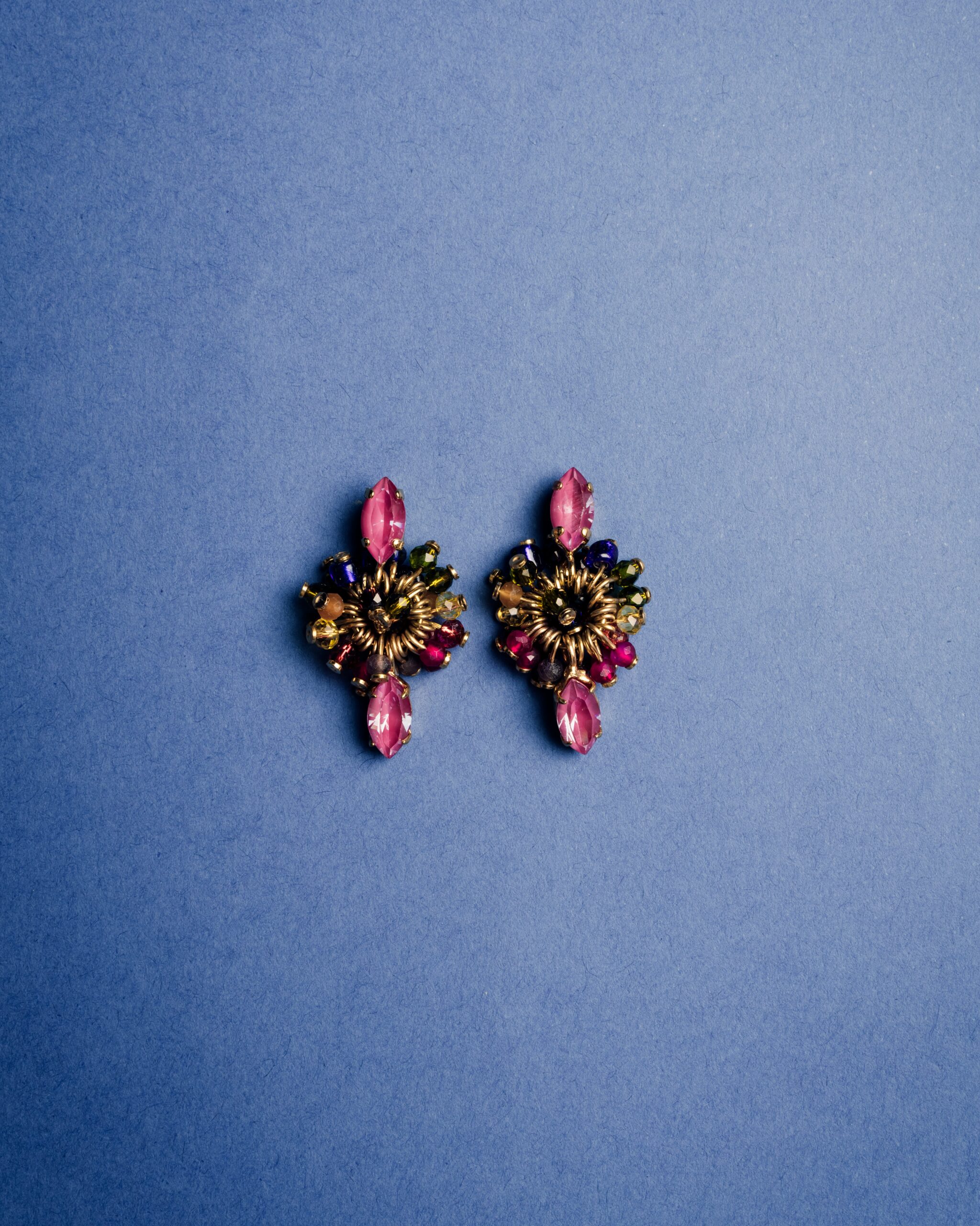 Este pendiente mediano combina dos cajas de cristal en tonos granate, una en forma de cabezal y otra como colgante, que aportan brillo y elegancia. El diseño se completa con un grupo de bolas multicolor de cristal, que añade un toque alegre y lleno de estilo.