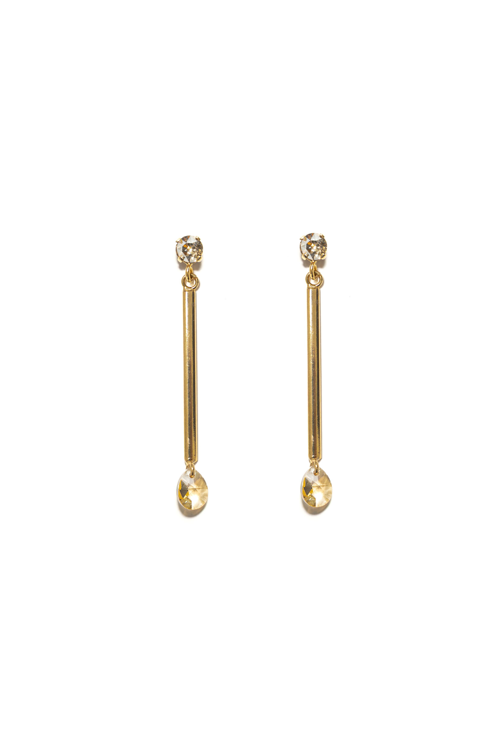 Pendientes elegantes y ligeros, con diseño de barra bañada en oro de 0,25 micras. Al final llevan una delicada lágrima de cristal austriaco con cabezal del mismo material, que aporta un brillo especial. Calidad cuidada en cada detalle.
