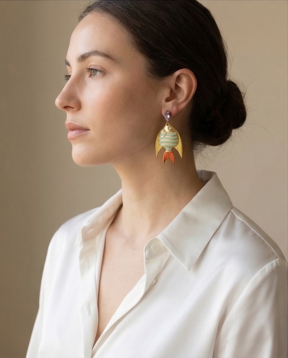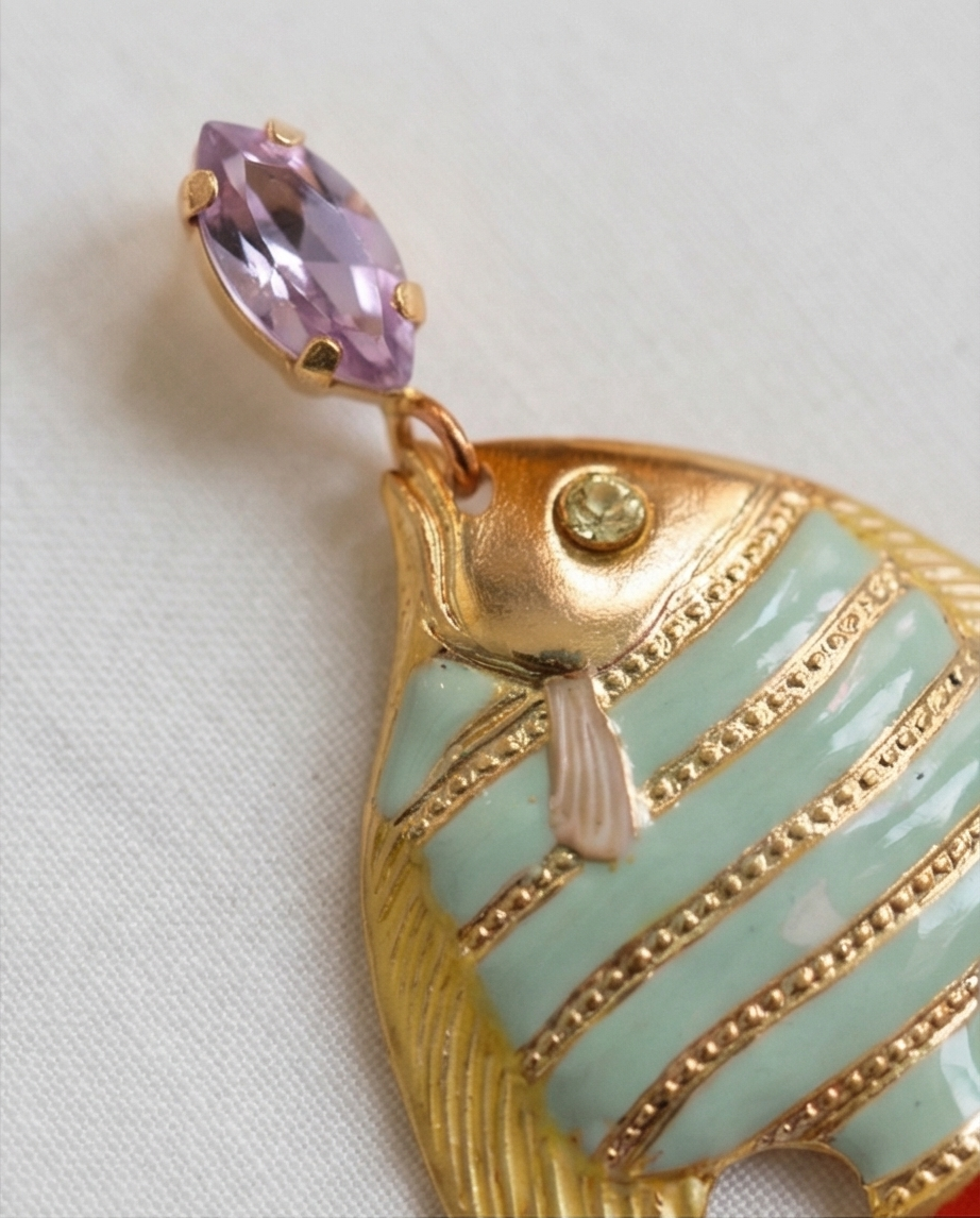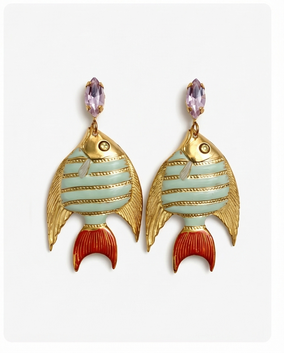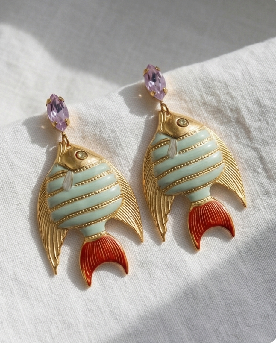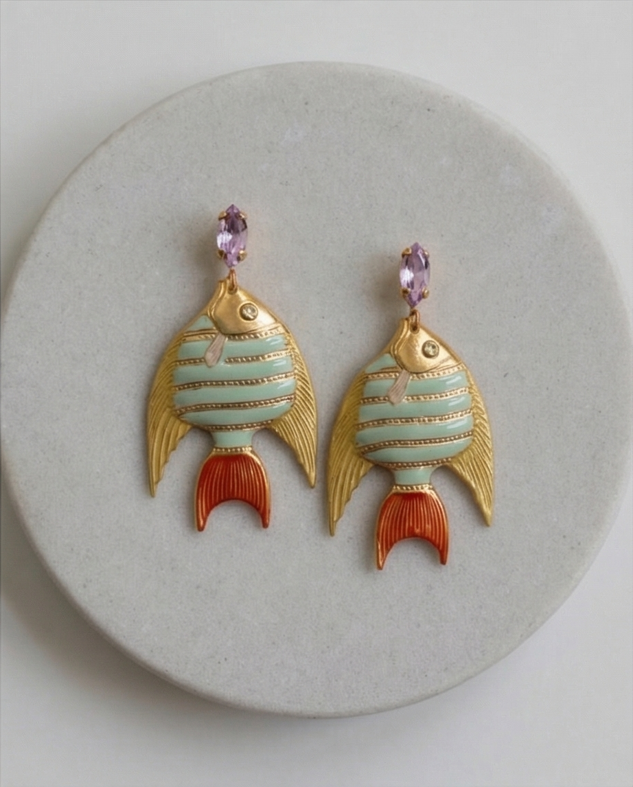 Diseño exclusivo de pendientes de pez, esmaltados al horno baño oro y cabezal de cristal. Alta bisutería local, creada en España con materiales de calidad y una atención minuciosa al detalle. 5 cm